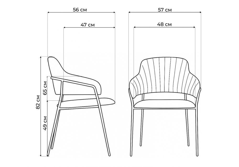 Высота подлокотников: 65 см. Материал каркаса - металл; Материал сиденья - велюр; Материал обивки - велюр; Ширина - 57; Глубина - 56; Высота - 82; Ширина сиденья - 48; Глубина сиденья - 47; Высота сиденья - 49;