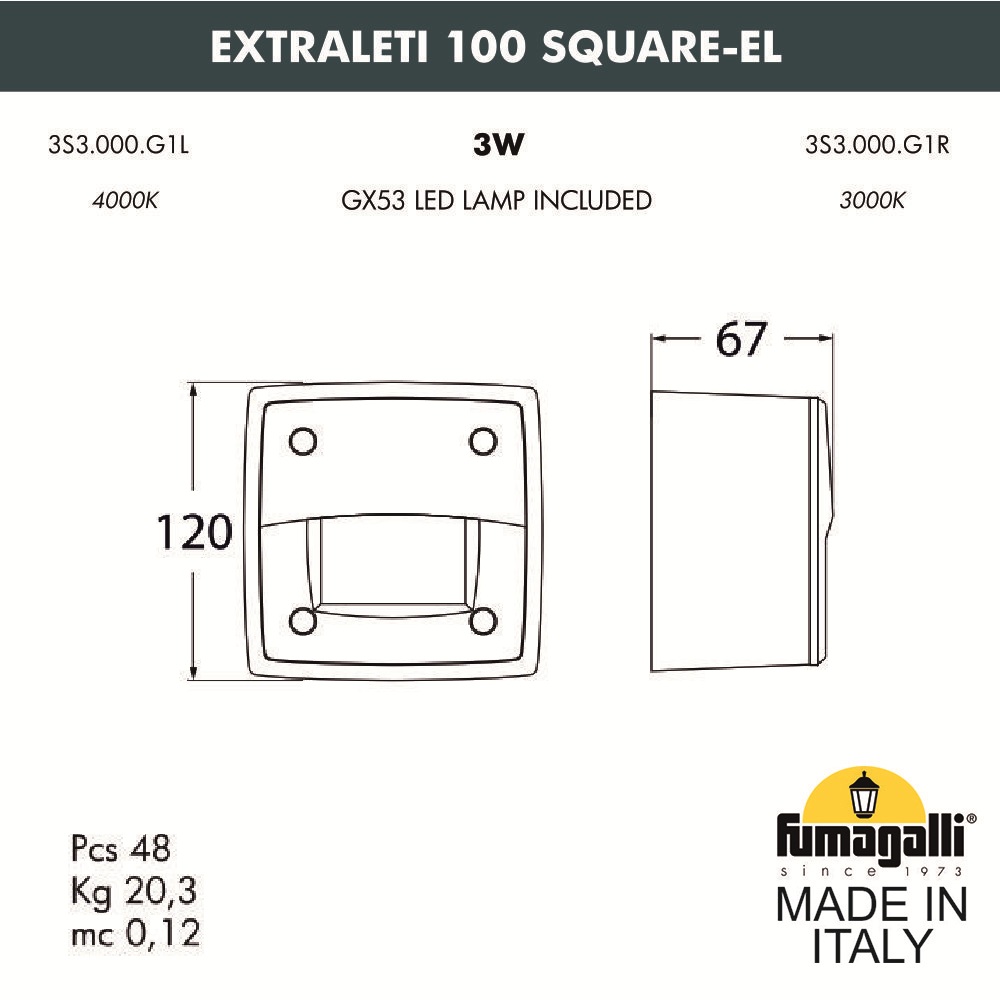 Светильник для подсветки лестниц накладной FUMAGALLI серии EXTRALETI, модель EXTRALETI 100 Square - изготовлен в Италии. Основное назначение - мягкое, акцентное освещение небольших площадей, световой дизайн, ландшафтная подсветка. Отлично подходит для освещения лестничных маршей, коридоров, подпорных стенок, ландшафтного освещения. Устанавливается в вертикальные поверхности, например в стены, колонны, откосы ступеней. На поверхность монтируется и закрепляется установочный элемент "стакан", в который выводится электрический провод. Далее, в данную деталь устанавливается сам уличный светильник EXTRALETI и подключается электропитание. Корпус изготовлен из современного вандалостойкого, негорючего полимера RESIN не требующего окраски. Прочного, окрашенного в массе, не ржавеющего и не выгорающего на солнце. Все светильники пыле-влаго защищены по стандарту IP66. Корпус ландшафтного светильника не проводит электричество, относится к 2 классу электробезопасности. Рассеиватель выполнен из антивандального, не мутнеющего и не горючего PMMA. Срок службы светильника - не менее 20 лет. Не требуется трансформатор. Напряжение питания - 220 В. Температура использования от -60 до +90. При заказе требуется выбрать цвет корпуса.