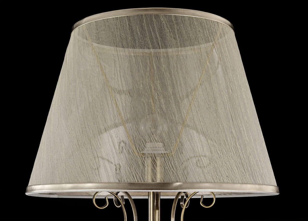 Шикарная модель бронзового, бежевого цвета изготовлена из металла. Плафон - конусный, выполнен из органзы. Стиль торшера - арт-деко,  он отлично подойдёт для спальни,  создаст уютную атмосферу, может служить, как для декоративного освещения, так и для функционального освещения места для чтения книги, например.