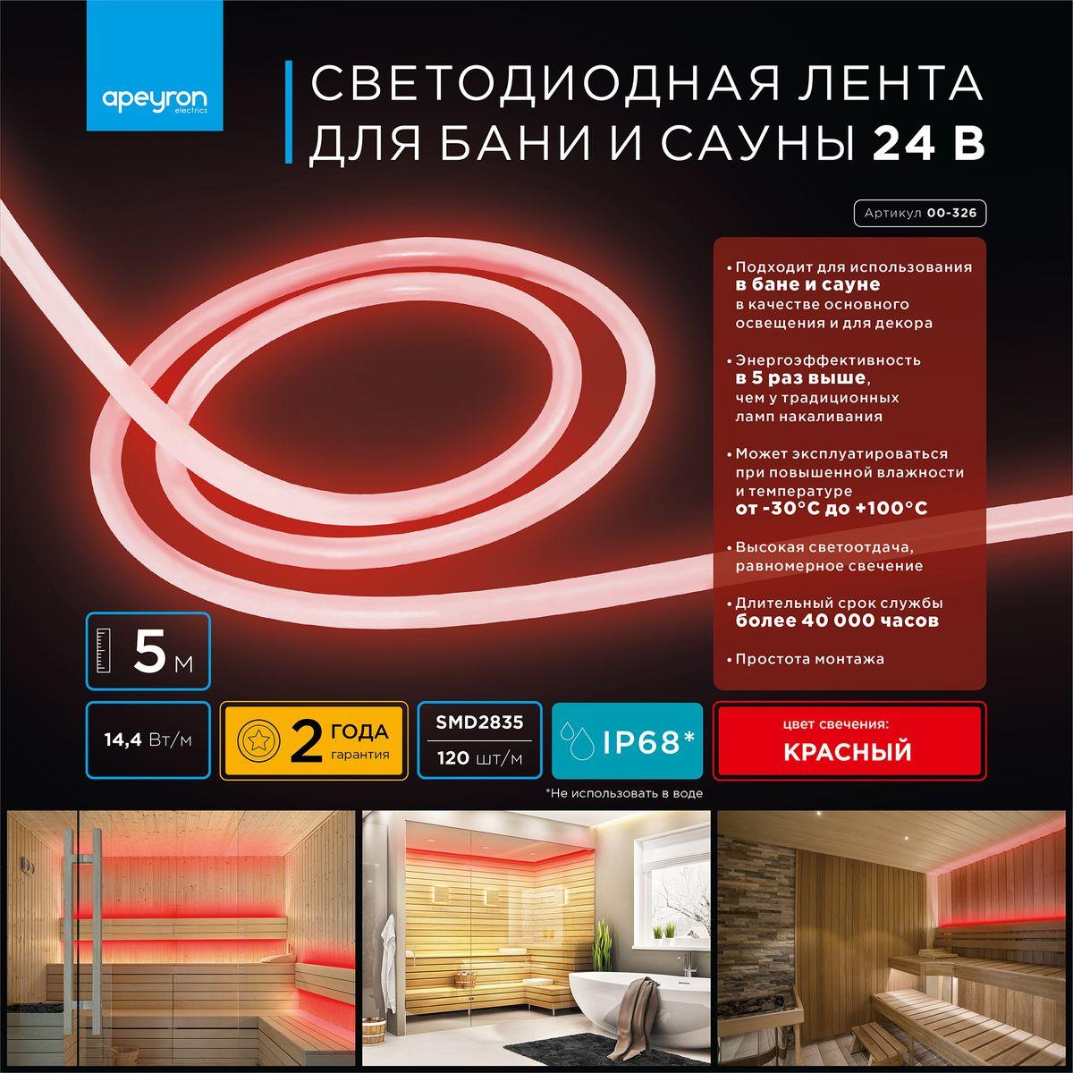 Влагозащищенная лента Apeyron 14, 4W/m 120LED/m 2835SMD красный 5M 00-326 в Иваново