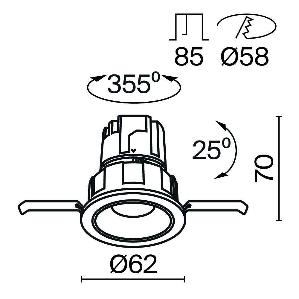 - Диаметр врезного отверстия: 58 мм (5.8 см)